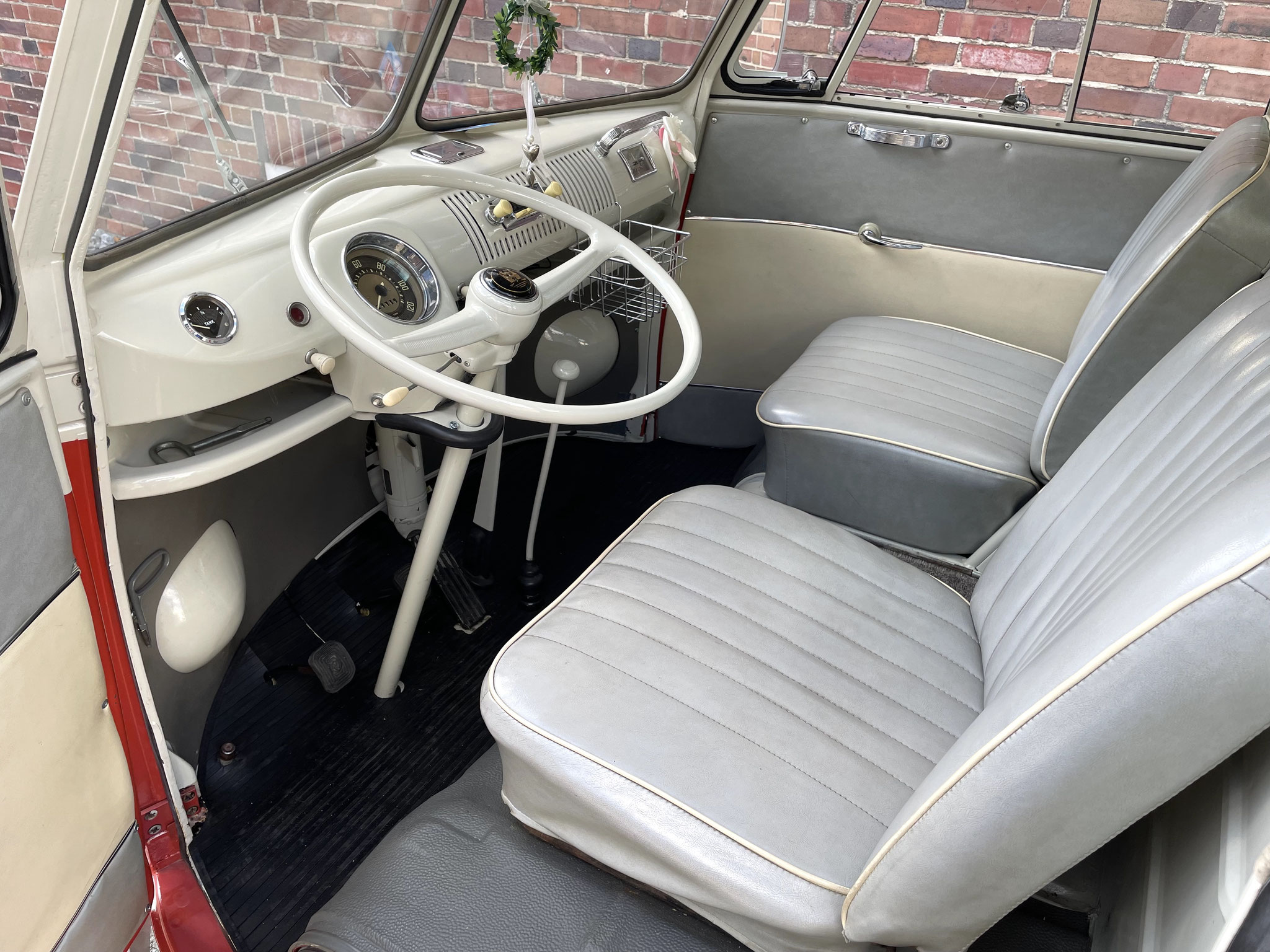 in Türkis, Mausgrau oder Siegellackrot. Ausgeliefert wurde dieser T1 in Mausgrau unten, kombiniert mit Perlweiß oben. Das gefiel einenm späteren Besitzer wohl nicht, weshalb er ihn in der